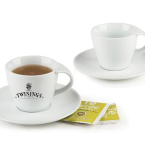 Clásico juego de 2 tazas de café o té con plato. Incluye: 4 piezas. CAP por taza: 6 OZ. El fino detalle que nunca puede faltar en casa. Presentación: caja en color blanco. Medidas: Taza ø 8.7 x 7.7 / Plato ø 16 cm